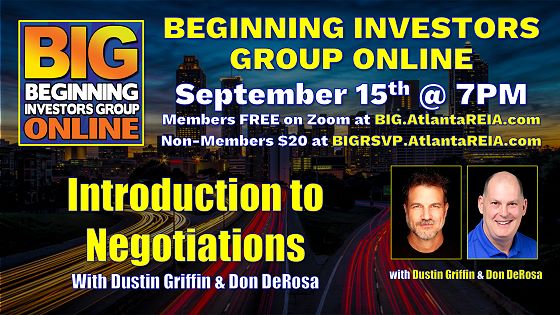 Atlanta REIA Members can attend at NO CHARGE. Not-Yet-Members can register online for $20 or pay $25 at the door. Register to attend In Person below.