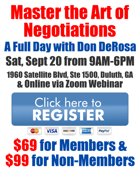 - SAT, October 25th @ 9AM: “Master the Art of Negotiations” Workshop with Don DeRosa